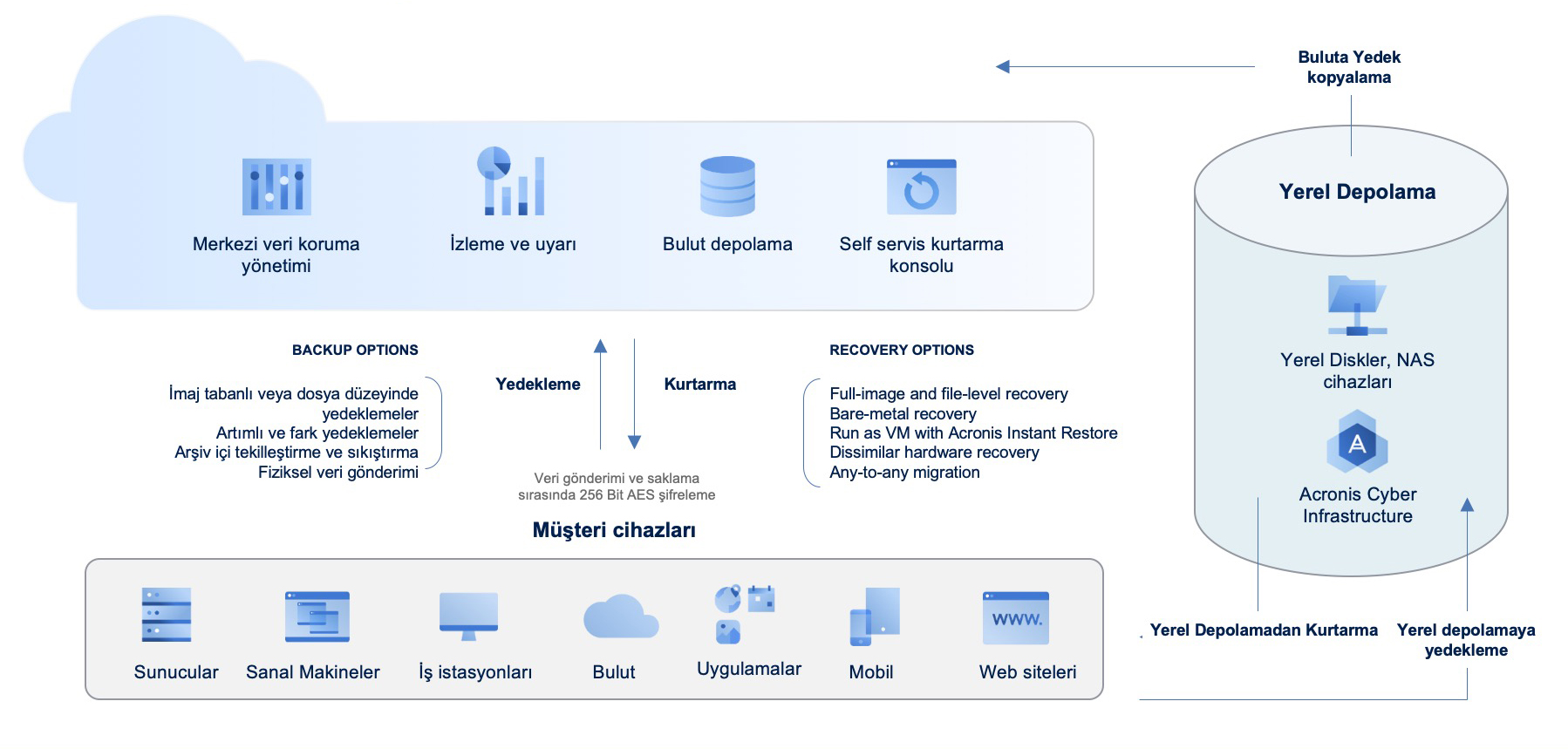 Kullanıma hazır bulut depolama seçenekleri arasında Google, Microsoft ve Acronis bulunur.